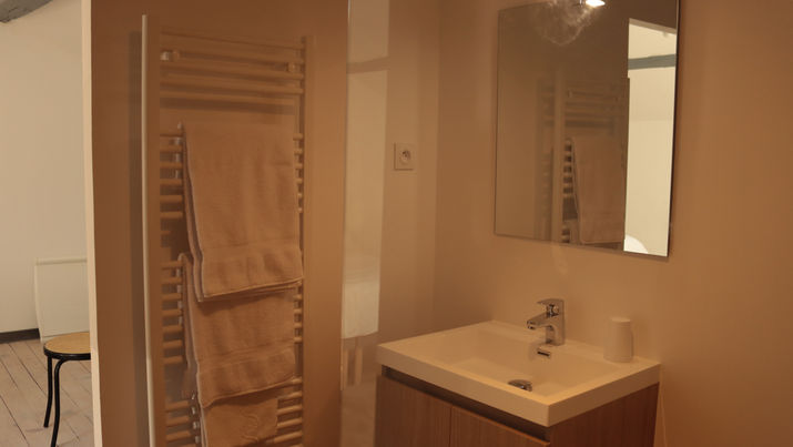 Au deuxième étage de la maison, desservie par un escalier privé, cette grande chambre est équipée d'un grand lit (couchage hôtelier). Pour plus de confort, elle est agrémentée d'un canapé et de petit mobilier d'appoint. La salle d'eau privée équipée d'une douche à l'italienne communique avec la pièce éclairée par un fenestron et une fenêtre de toit.